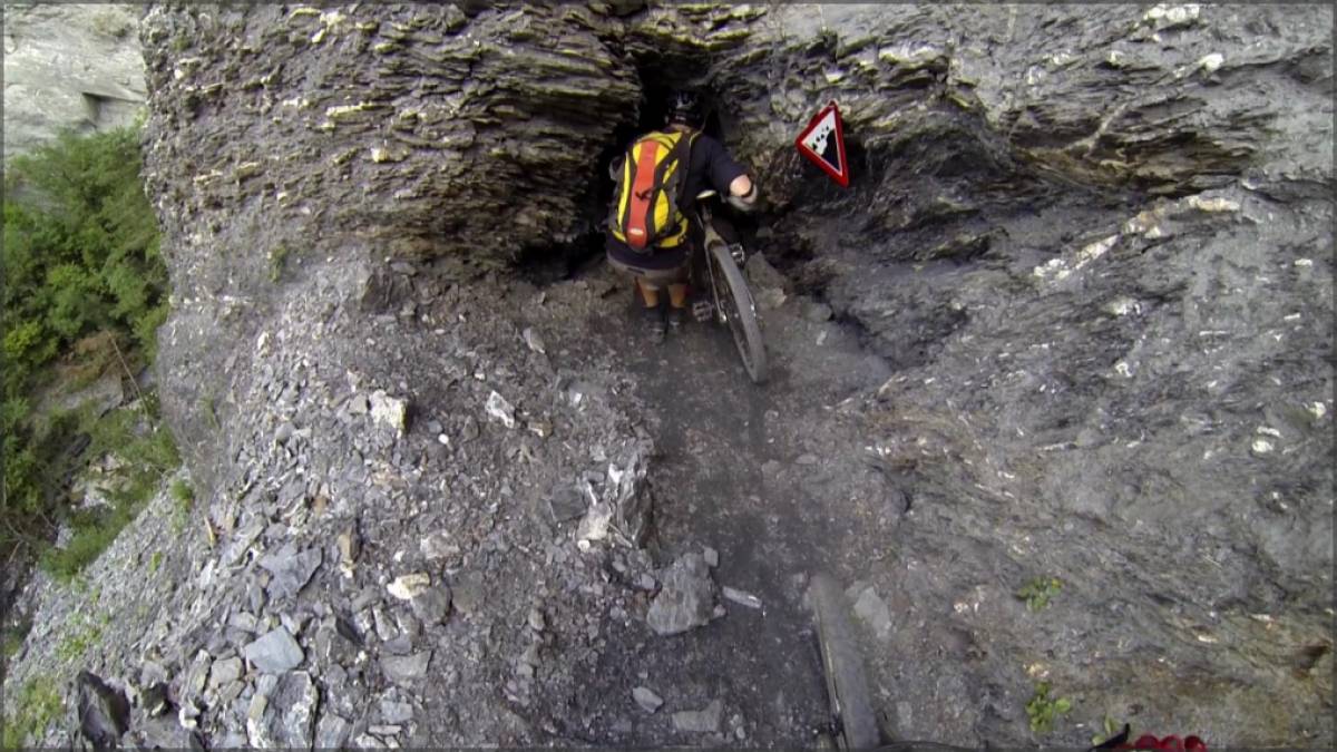 - une partie très exposée, limite dangereuse, longer la falaise main droite tenant la corde de sécurité et main gauche le vélo...