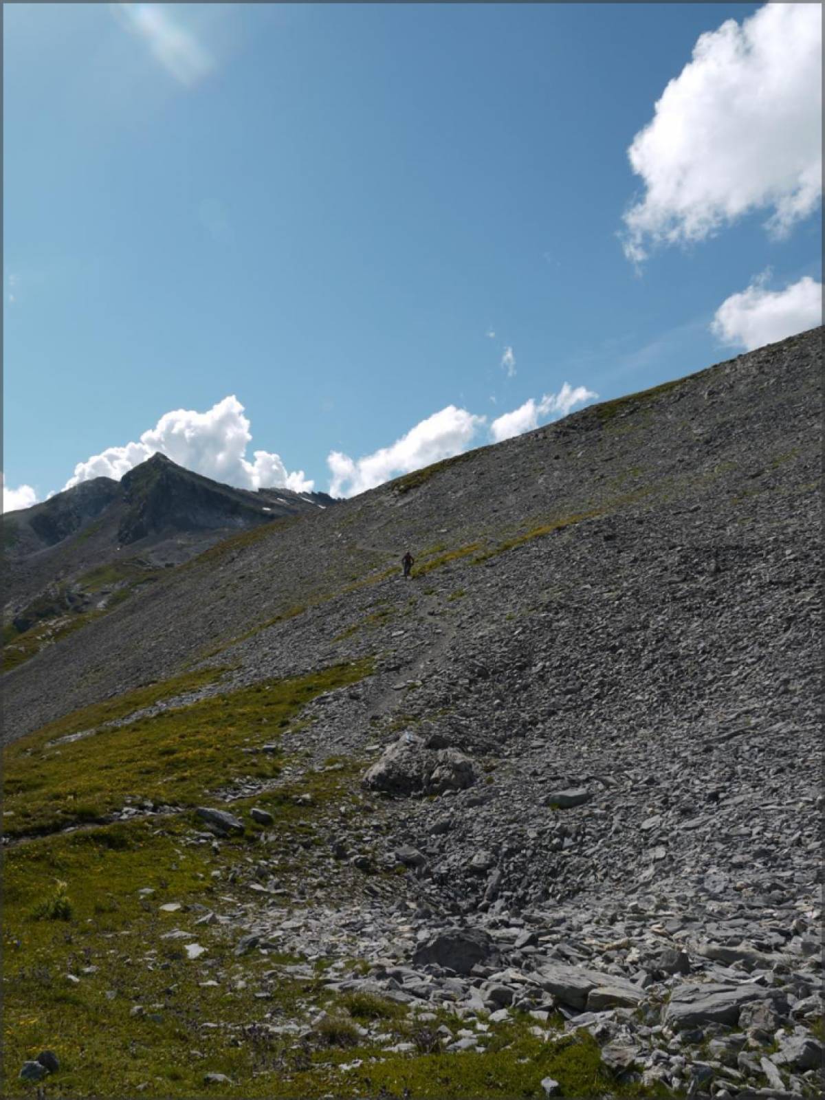 De là commence la descente jusqu'à la Cabane de Fenestral. Cette descente est du pur Freeride à travers dalles, éboulements et névés. Aucun sentier n'est tracé. De plus, certains passages ne peuvent se faire qu'à pied et se rapprochent plus de la 'déséscalade' que de la marche. A nouveau, un minimum de 3 personnes est nécessaire pour les passer sans encombres.