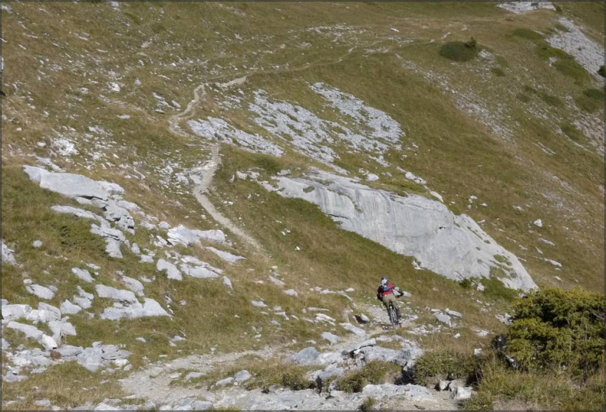 A l'embranchement du point 1712, on partira sur la droite sur la piste 4x4 bien raide. 500m après la première épingle, on croisera un sentier pédestre. Il faudra alors passer au-dessous de votre VTT pour le petit portage (30-45 minutes) qui permettra de rejoindre le sentier qui passe au pied du Varneralp.