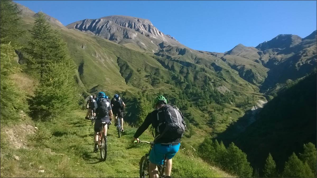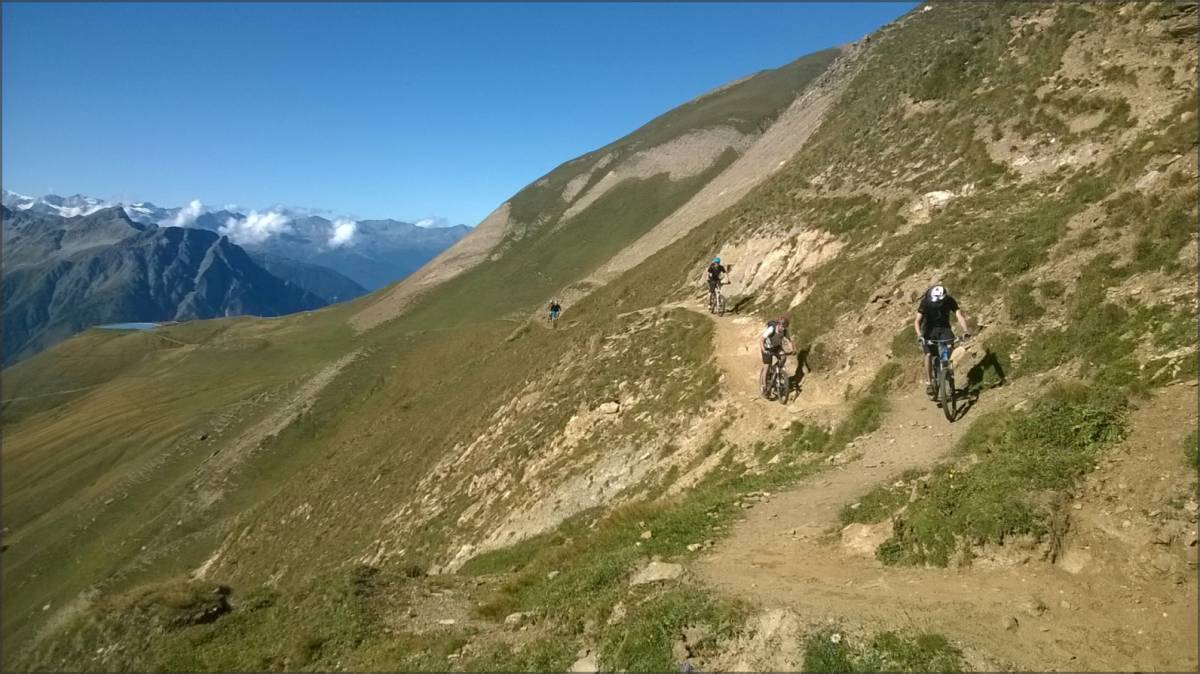 De Bärg, on emprunte le sentier qui traverse à flanc de coteaux (bien roulant, mais parsemé de quelques petits coups de cul) et qui permet de récupérer une piste qui elle-même nous amène au sentier joueur qui descend sur Binnega, Wasen puis Z'Brigg.
