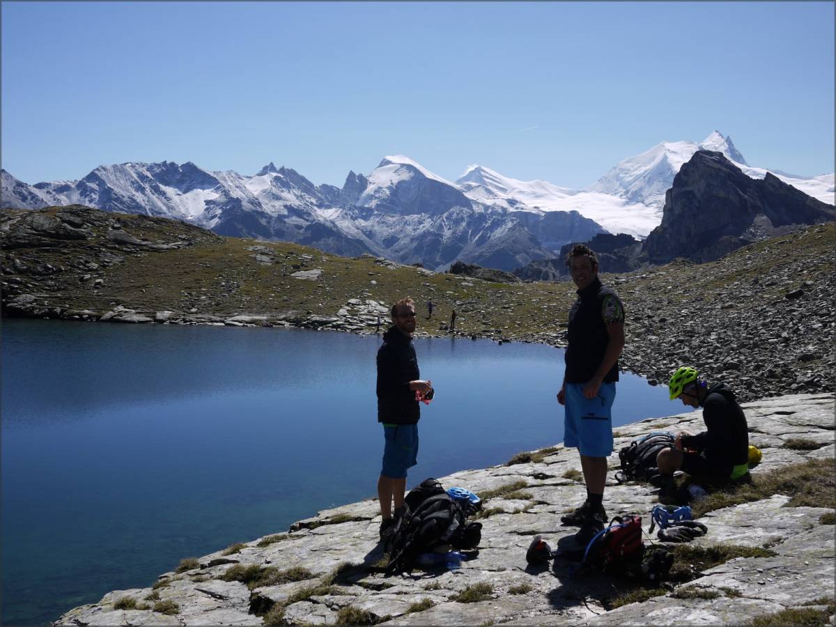 Le Meidpass se prête fantastiquement bien à une pause pic-nic. Puis, c'est une descente dans un grandiose décor alpin, d'abord sur le Lac d'Armina où un bref coup de cul permet de rejoindre la Fêta d'Août avant de poursuivre sur la Cabane Bella Tola puis Chandolin, le tout sous l'oeil attentif de la Dent Blanche !