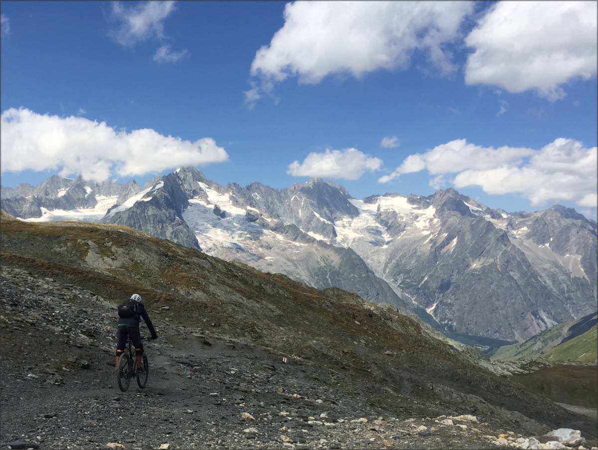 Suit la première belle descente sur les lacs des Fenêtre , environ 250m de D- avec des passages bien roulants et en toile de fond le massif du Mt Blanc. Du pur bonheur !